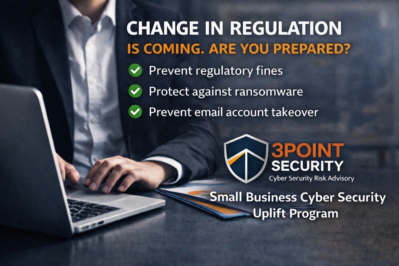 The 3 Point Security Small Business cyber uplift program is focused on delivering a 90 day uplift program designed to significantly reduce the likelihood and impact of ransomware, email compromise, and credential based attacks.